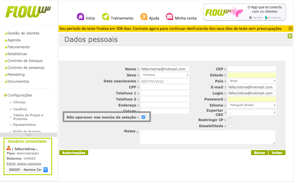 Como você sabe, o sistema FLOWww organiza-se através de usuários de acesso - aquelas pessoas que tem acesso ao seu sistema, (como por exemplo, sua recepcionista, ...